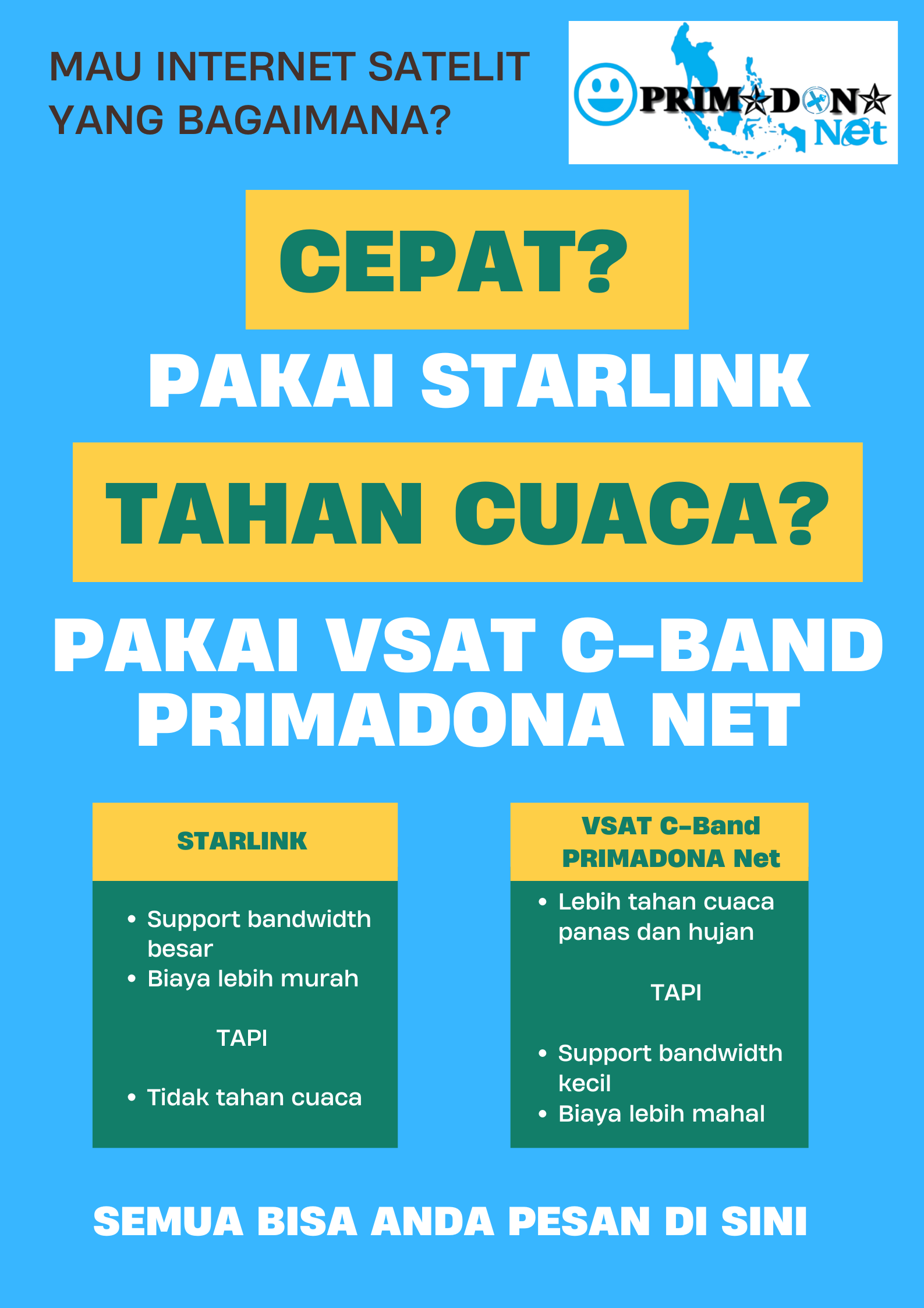Anda mau koneksi internet satelit VSAT yang stabil? Kestabilan koneksi adalah prioritas Provider-Provider di Jaringan PRIMADONA Net…Dan untuk jenis VSAT tertentu Anda juga tidak perlu untuk membeli perangkat VSAT karena kami menyediakan Opsi Pinjam maupun Opsi Sewa Perangkat…Kami siap support instalasi internet satelit VSAT di seluruh daerah di Indonesia hingga di lokasi terpencil sekalipun…Harap berhati-hati pada pihak yang tidak bertanggung jawab yang mengatasnamakan PRIMADONA Net tanpa rekomendasi dari manajemen PRIMADONA Net…Nomor telepon resmi PRIMADONA Net hanya yang tertulis dalam website PRIMADONA Net kecuali jika sewaktu-waktu ada nomor telepon lain dari tim kami yang kami rekomendasikan kepada Anda…Untuk sementara segmentasi kami baru untuk pelanggan Enterprise seperti Instansi Pemerintah, Lembaga Negara, Lembaga Militer, Corporate (Perusahaan BUMN, Swasta, Perbankan, Supermarket, Minimarket dan lain-lain), dan Fasilitas-Fasilitas Layanan Masyarakat (Sekolah, Kampus, Rumah Sakit, Puskesmas, Bandara, Terminal, Pelabuhan, Tempat Rekreasi, dan lain-lain)…Untuk sementara kami belum bisa support untuk pelanggan Personal (Perorangan/Warnet/RT RW Net)…